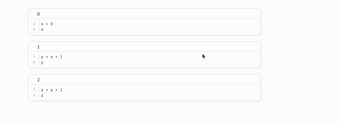 Traditional notebooks like Jupyter have hidden state: running a cell may change the values of global variables, but these changes are not propagated to the cells that use them. Worse, deleting a cell removes global variables from visible code but not from program memory, a common source of bugs. The problem of hidden state has been discussed by many others [1] [2].