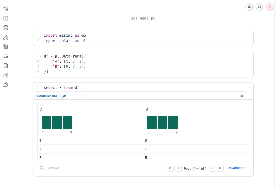 marimo lets you can mix and match Python and SQL: Use SQL to query Python dataframes (or databases like SQLite and Postgres), and get the query result back as a Python dataframe.